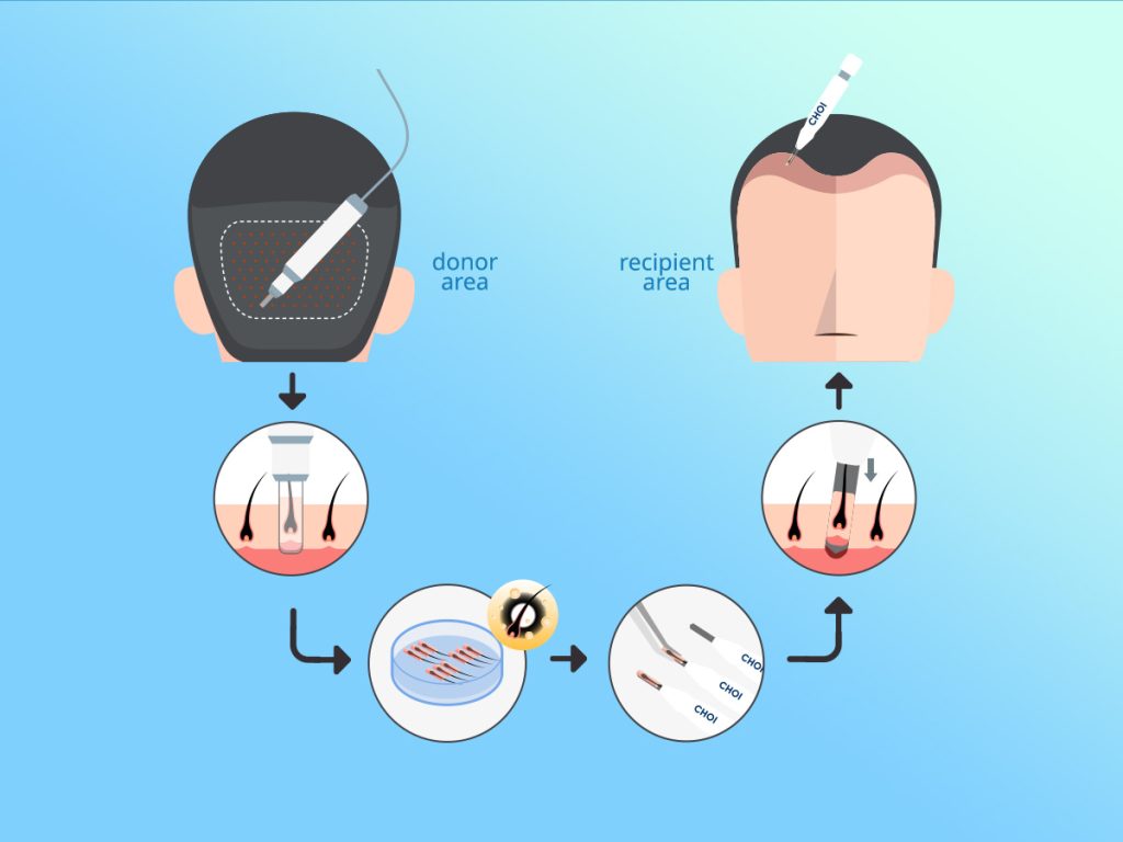 Follicles are extracted individually (one follicle at a time) and directly from the back of the scalp randomly, using specialized tools. When extraction is done correctly, this technique doesn’t leave any scars. The donor area heals faster than in old traditional methods, like the FUT technique.
