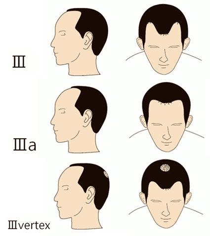 مقياس نوروود –المرحلة -3:تمثل الحد الأدنى من فقدان الشعر التي تعد كافية لتسمى صلع وفقاً لنوروود. خلال هذه المرحلة تظهر معظم فروة الرأس انحساراً متناظراً للشعر في المنطقة الصدغية حيث تصبح إما خالية من الشعر أو مغطاة بشعر خفيف جداً. في المرحلة 3 قمة الرأس، تضاف قمة الرأس لأنها شائعة الحدوث مع التقدم بالعمر. فقدان الشعر بشكل أولي من قمة الرأس مع تراجع بسيط للشعر في المنطقة الصدغية. |
