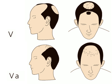 مقياس نوروود –المرحلة -6:تم خسارة جسر الشعر الذي كان يمر عبر قمة الرأس مع بضع شعرات فقط متبقية. المنطقة الصدغية الأمامية وقمة الرأس انضموا ليشكلوا منطقة واحدة. ازداد فقدان الشعر على الجوانب. |