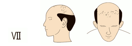 مقياس نوروود –المرحلة -7:هي الشكل الأكثر تقدماً وشدة في فقدان الشعر. شريط ضيق من الشعر نجا على جانبي وخلف فروة الرأس. الشعر في هذه المنطقة يكون جيداً وأقل كثافة من ذي قبل. يشكل الشعر نصف دائرة في مؤخرة العنق بين الاذنين. |