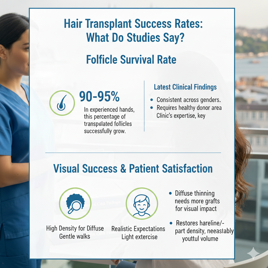 إذاً، ما هو الرقم الواقعي؟ في العيادات المرموقة التي تخضع لإشراف طبي وتستخدم تقنيات FUE أو DHI الحديثة، يتراوح معدل بقاء بصيلات الشعر عادةً بين 90% و 95%.
