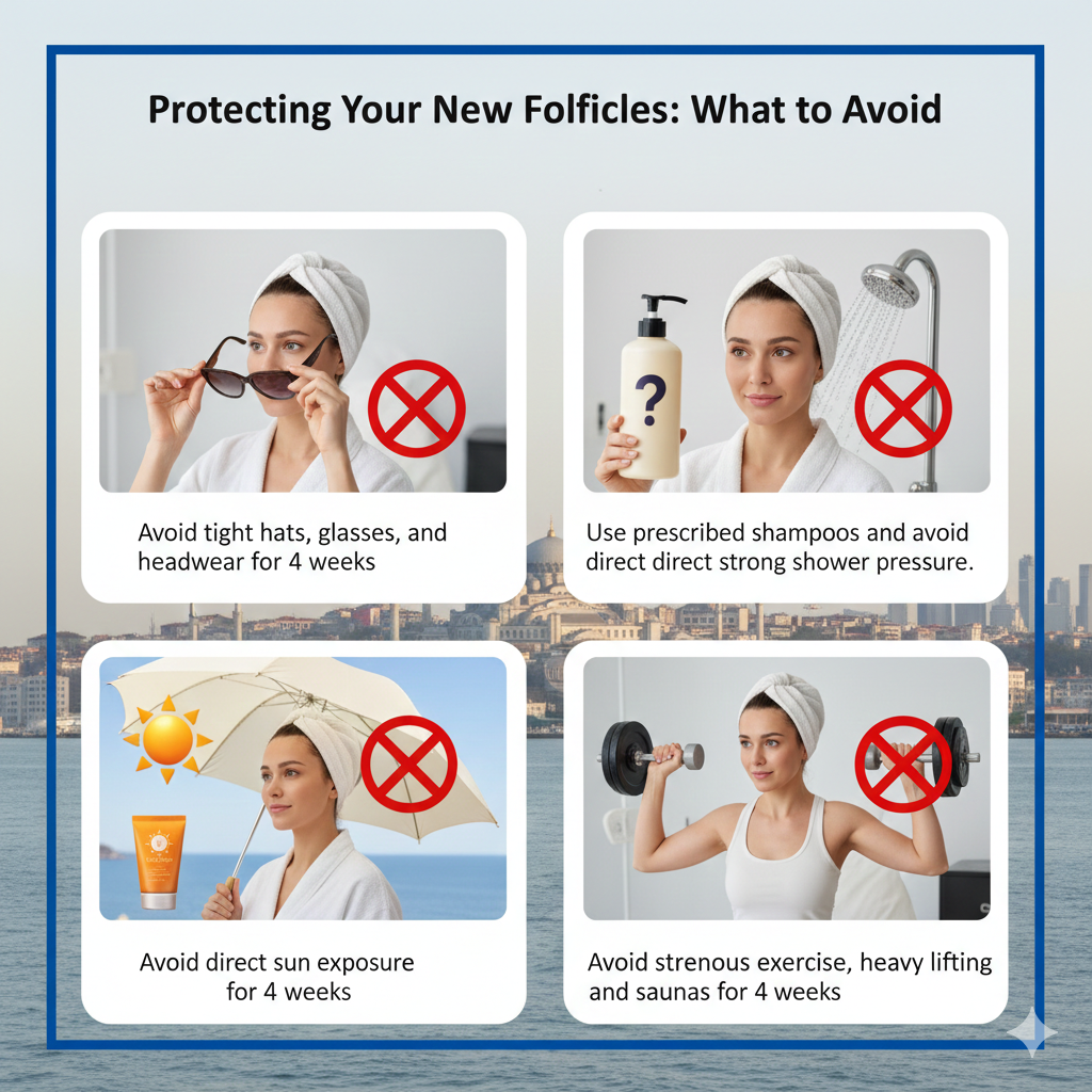 - أغطية الرأس: لا ترتدِ القبعات الضيقة، القبعات الصوفية (Beanies)، أو الخوذات لمدة 10-14 يوماً على الأقل. أي ضغط على البصيلات يمكن أن يضر بإمدادات الدم لها.