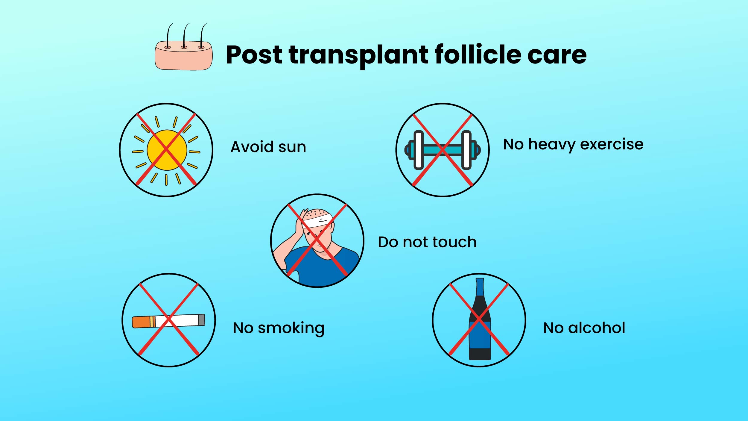 - أشعة الشمس المباشرة: تجنب تعريض فروة رأسك لأشعة الشمس القوية والمباشرة للشهر الأول. الجلد مخدر ويمكن أن يحترق بسهولة، مما يؤدي إلى تصبغ دائم (بقع داكنة) أو تندب.